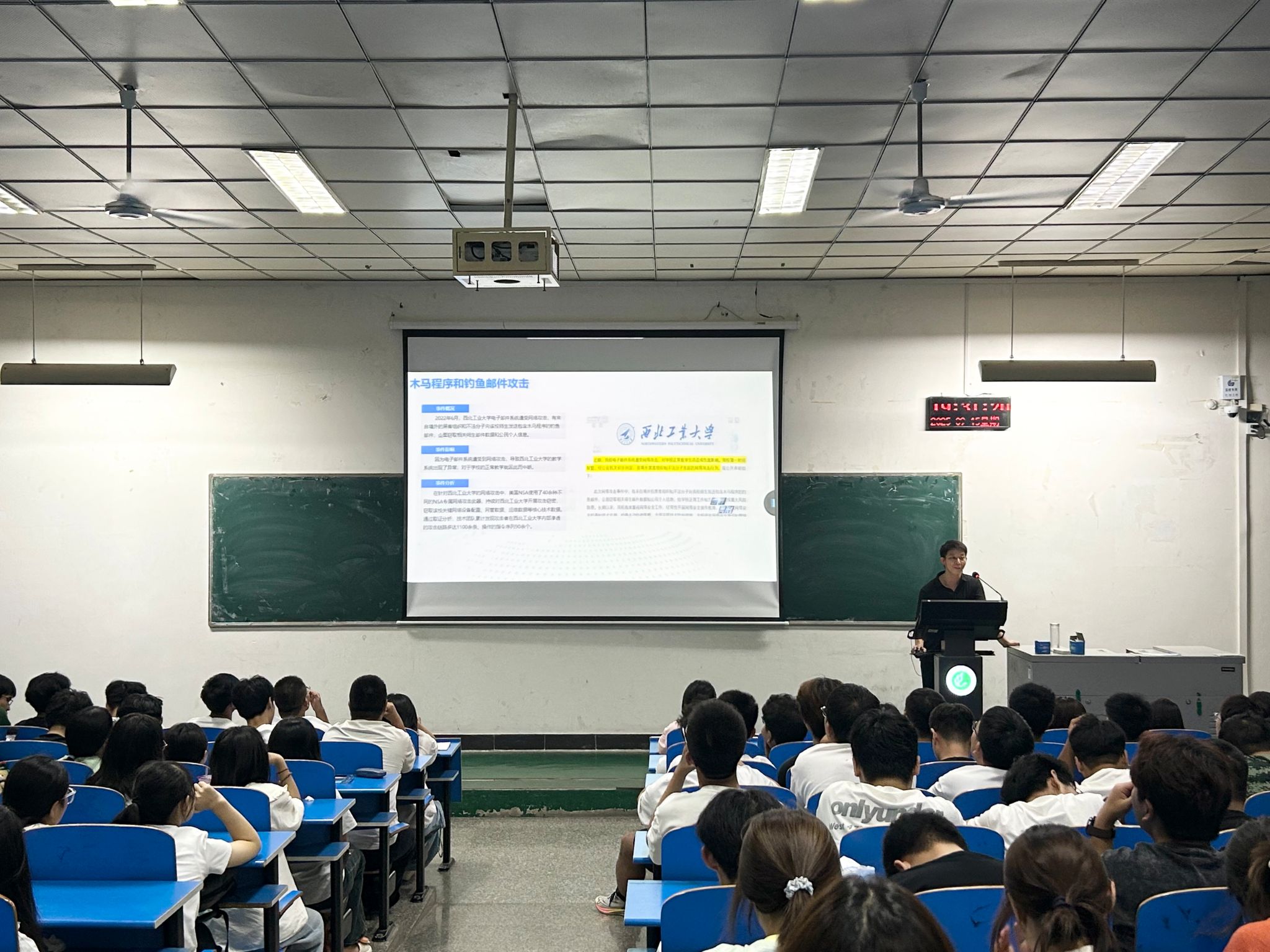 讲座中,孙亚南首先分析网络安全整体形势,指出网络安全威胁无处不在,已经渗透到我们生活的方方面面。从个人隐私泄露到企业商业机密被盗,从网络诈骗频发导致个人财产受损,到关键信息基础设施遭受攻击,网络安全事件层出不穷,其影响范围之广、危害程度之深令人触目惊心,提升防范能力刻不容缓。随后,他聚焦常见的网络安全隐患,明确三类风险:一是网络兼职、冒充熟人等诈骗陷阱;二是非正规网络行为导致的个人信息泄露;三是恶意软件对设备与数据的威胁,为新生敲响安全警钟。接下来,为了规范网络空间秩序,孙亚南为同学们解读了《中华人民共和国网络安全法》《中华人民共和国个人信息保护法》等网络安全法律法规,并表示这些法律明确了各方在网络空间中的权利和义务,为我们营造安全、健康的网络环境提供了坚实的法律保障。作为新时代的大学生,我们必须认真学习这些法律法规,自觉遵守,做文明网民,并审慎对待网络信息与个人隐私,规范网络行为,提高安全意识,共同筑牢校园网络安全屏障。