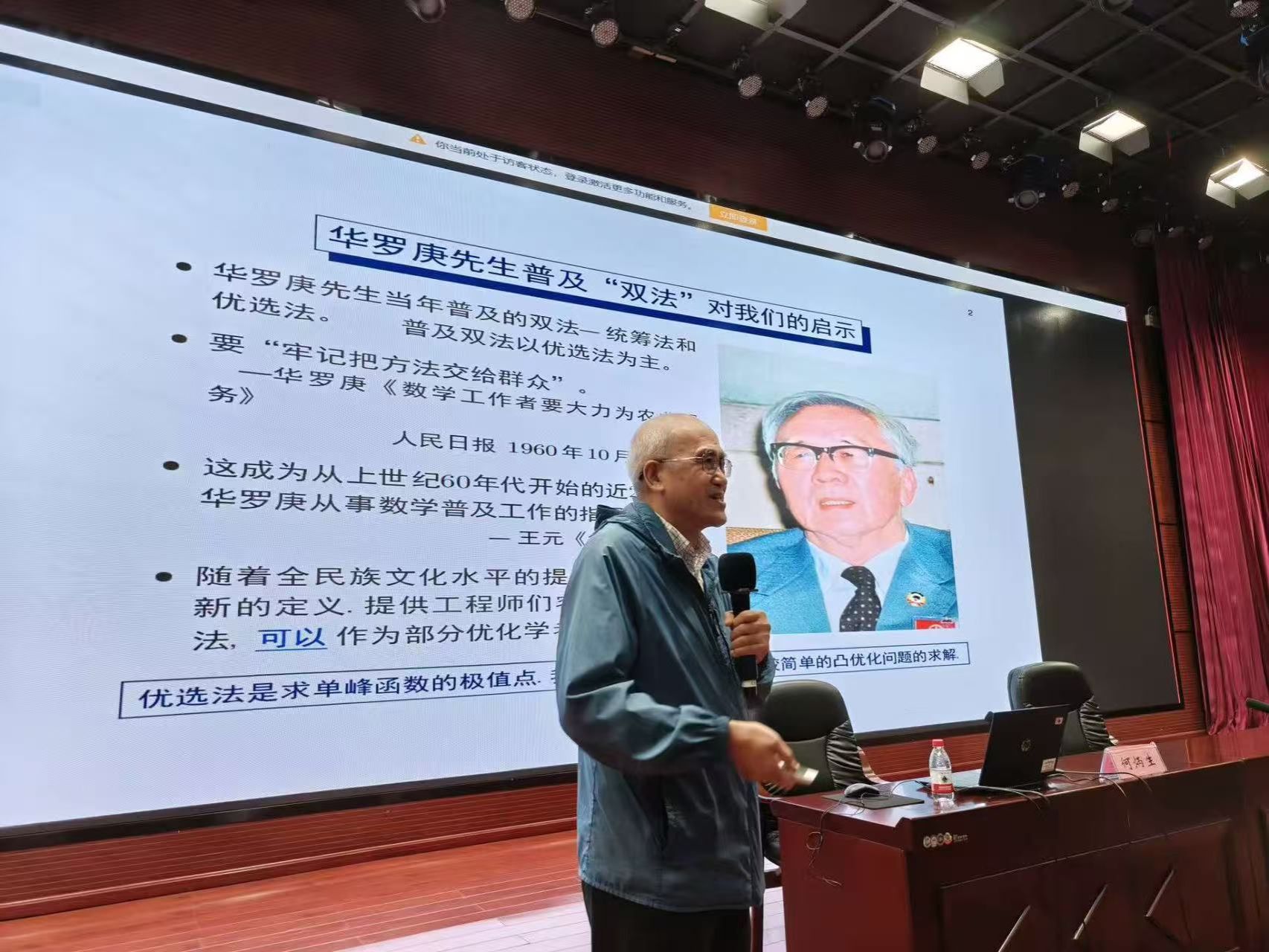 报告会上,何炳生教授从华罗庚的牢记“把方法交给群众”的思想谈起,指出科学与工程计算中出现的许多优化问题都可以归结为一个变分不等式,并用“瞎子爬山判别是否到达顶点”生动形象地刻画了变分不等式的数学内涵。报告讲述了如何利用普通的大学数学和一般的优化原理,以变分不等式为工具,做出一些被国际同行知名学者誉为“Very Simple yet Powerful”和“Elegant”的研究工作。报告强调利用初等的积化和差恒等式和一些分块矩阵的知识,就能相当容易地设计出一簇凸优化的收缩方法。报告打破了高端数学研究必须依赖复杂工具的刻板印象,让复杂问题简单化的研究思路变得具体可感,为我院学子打开了优化领域的前沿视窗,有效激发了青年学生扎根基础、勇于探索的科研热情。报告生动展现了一条从基础理论通向高水平创新的清晰路径,对我校培养兼具扎实学识与创新能力的拔尖人才具有积极的推动作用。