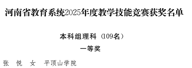 近日,河南省教育系统2025年度教学技能竞赛圆满落幕,经过激烈角逐,我院教师张悦凭借扎实的专业功底、创新的教学设计和鲜明的授课特色,生动的教学表现,在众多优秀选手中脱颖而出,荣获理科组一等奖的好成绩。