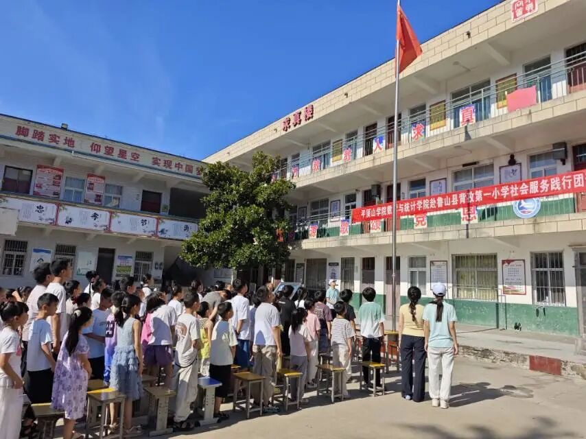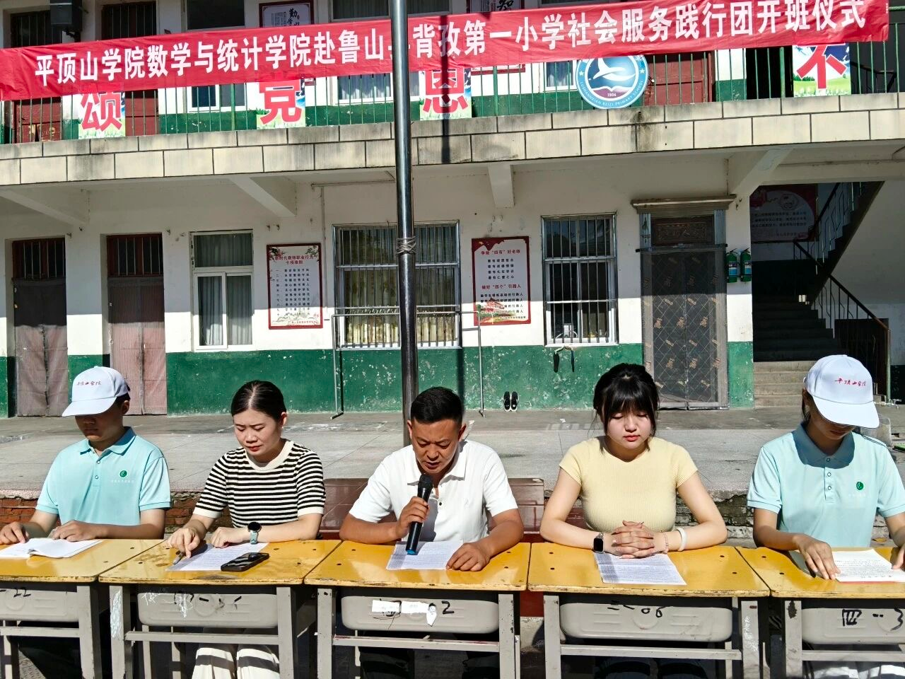 7月3日,太阳集团网址8722"数绘仲夏,携手助学"社会服务践行团开班仪式在鲁山县背孜第一小学举行,第一小学校长闫良各,践行团带队老师詹美晨、郑梦园,全体志愿者及七十余名学生与家长参加,仪式由带队老师郑梦园主持。