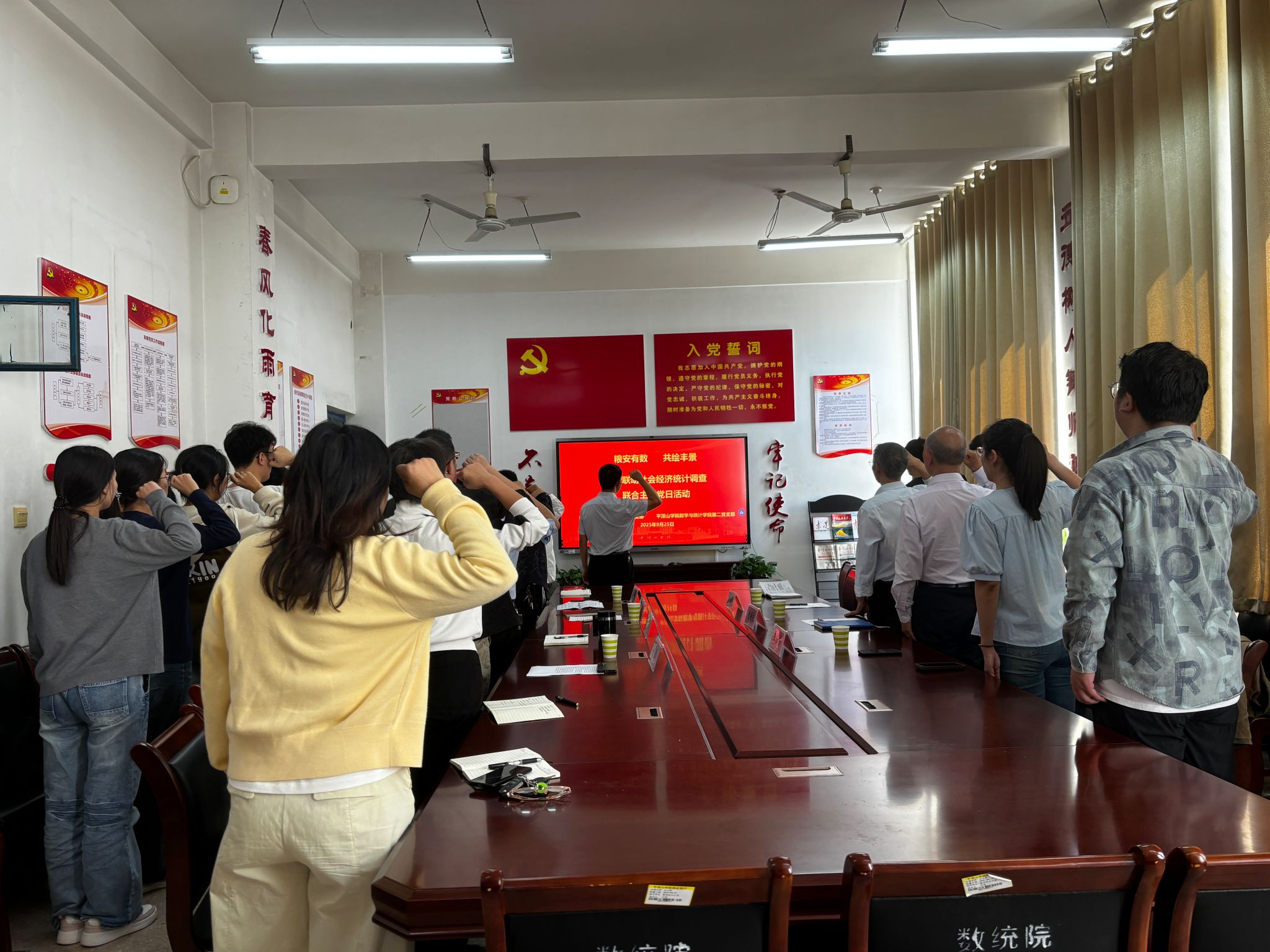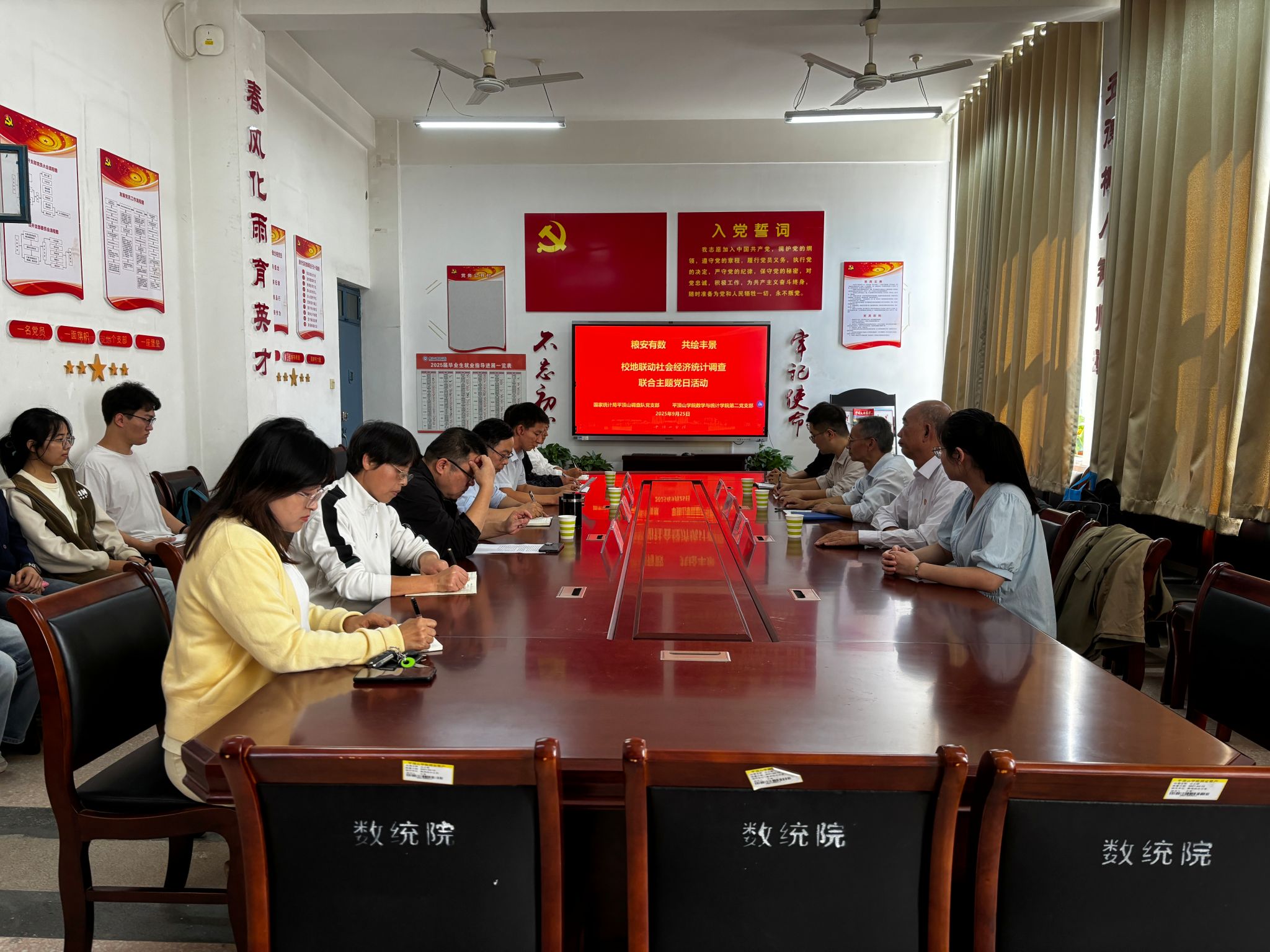 为进一步推动党建与业务深度融合,2025年9月25日下午,太阳集团网址8722第二党支部与国家统计局平顶山调查队(以下简称调查队)党支部携手开展了“粮安有数·共绘丰景”校地联动社会经济统计调查联合主题党日活动,通过座谈交流、实地调研等形式,共商党建与业务融合发展路径,共促统计事业服务地方发展能力提升。双方共有17位党员参加了此次活动。