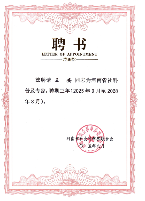 近日,河南省社科联公布《关于聘任河南省社科普及专家(宣讲师)的通知》,我院教师王安副教授被聘为河南省社科普及专家,聘期三年。
