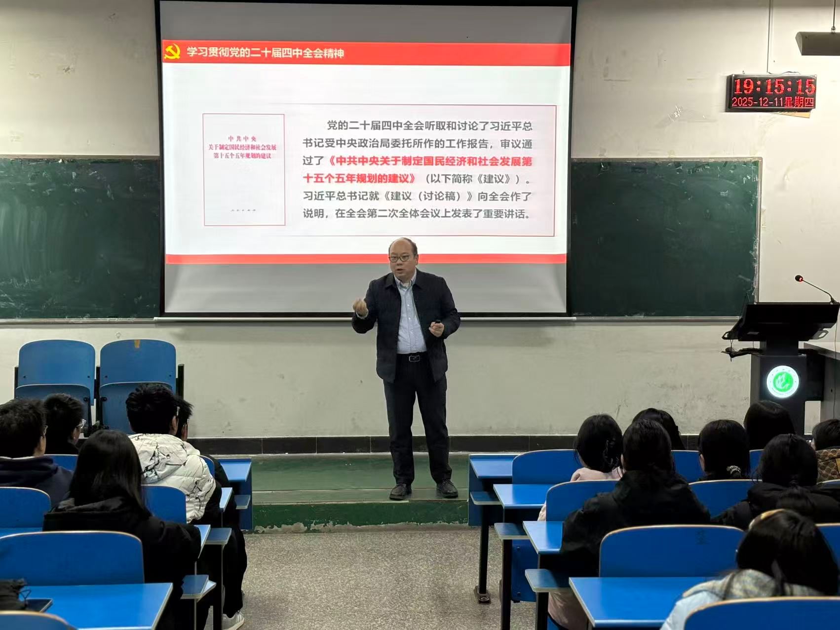 为引导广大师生深刻领会党的二十届四中全会核心要义与实践要求,自觉将思想和行动统一到“十五五”时期国家发展大局和战略部署上来,12月11日晚,副校长代克杰在2306教室为太阳集团网址87222025级全体学生作党的二十届四中全会精神专题宣讲报告。宣讲会由学院党委书记张建林主持。